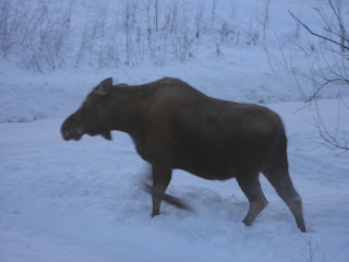 Well its a chilly minus 32 here at the cabin. That is cold even for those of us born wearing fur coats. Still, a girl has got to eat to maintain her figure, and that's what this one is doing on the road outside my place. With the dogs inside this moose and another were browsing through the yard this morning dining on willow. If this is the same mother/child pair from last year, Jr has really packed on the pounds as he is nearly the same size.
